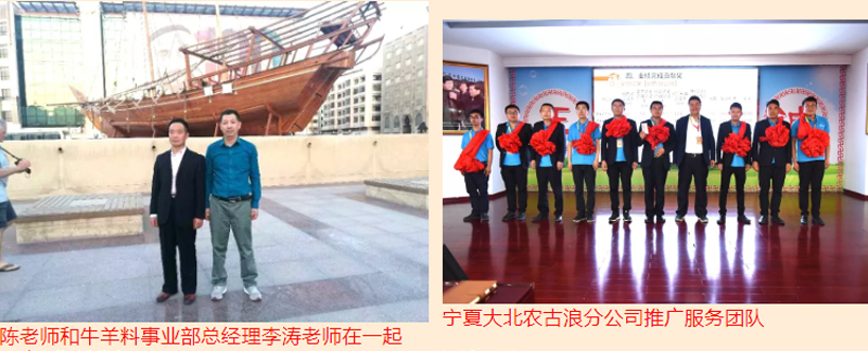 陈老师在十多年的经营中,始终保持着与宁夏大北农文化理念同步,紧跟公司发展步伐,在发展的道路上事事追求着第一,现在的陈老师是宁夏大北农事业财富共同体常务副主任。陈老师的事业并非一帆风顺,也曾历经心酸坎坷,之所以能坚持和大北农合作这么多年是源于相信大北农,因为大北农数次在艰难时刻给予他的帮扶,在市场、资金、技术等多方面受挫的时候,大北农加大扶持力度,帮助陈老师平稳度过难关。宁夏大北农牛羊料事业部总经理李涛老师、技术总工丁保林老师,及宁夏大北农的技术服务专家团队,都曾多次对陈老师进行指导,与其合力开拓市场。