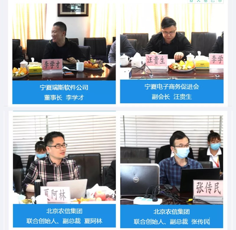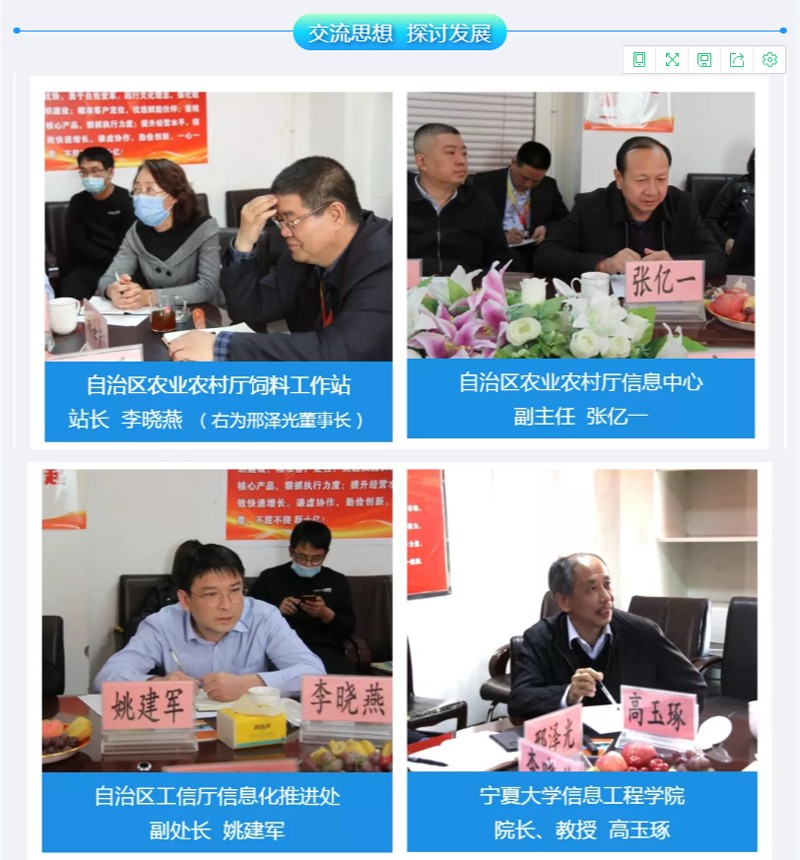 自治区农牧厅饲料工作站站长李晓燕、信息中心副主任张亿一,自治区工信厅信息化推进处副处长姚建军,宁夏大学信息工程学院院长、教授高玉琢和副院长、教授孙学宏,西部(宁夏)智慧产业有限公司董事长王晓龙,国家智能铸造产业创新中心工业云运营总监唐晋升,中科院银川科技创新与产业育成中心副主任章建,宁夏瑞斯软件公司董事长李学才,宁夏电子商务促进会副会长汪贵生,北京农信集团联合创始人、副总裁夏阿林和联合创始人、副总裁张传民,及宁夏大北农董事长邢泽光、总经理田鹏等参加会议。宁夏大北农市场科创中心总监许迟主持会议。